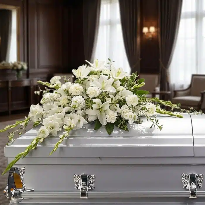 Delicado y bello Arreglo Fúnebre Cubre Caja Asunción de condolencias para colocar sobre la caja fúnebre, expresa tu sentido pésame enviando este lindo diseño cubre caja.
