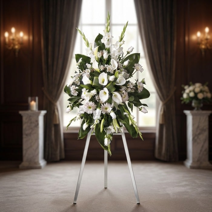 En momentos de despedida, las palabras a veces no son suficientes. Deje que esta hermosa ofrenda en cascada, elaborada con la pureza de los cartuchos o lirios blancos, hable por usted. Cada flor fresca de temporada se une en un diseño elegante para transmitir un mensaje de amor, respeto y consuelo.
