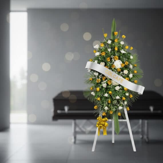 Este elegante pedestal fúnebre es un tributo cálido, diseñado con la esperanza de las rosas amarillas y la serenidad de las hortensias. Es la forma más sincera de decir «estoy contigo» y ofrecer consuelo cuando las palabras no son suficientes. 🤍